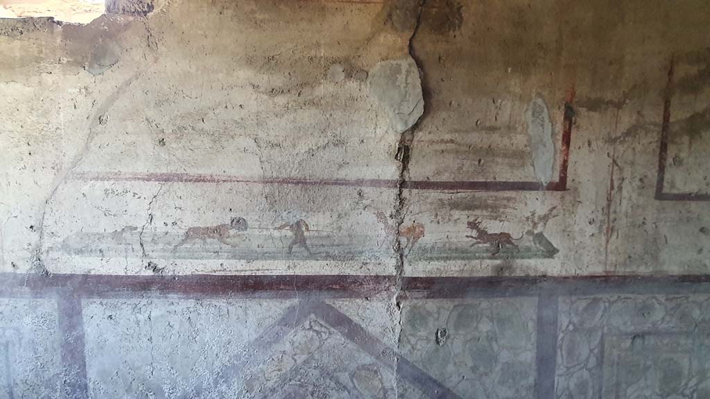 VI.10.1 Pompeii. July 2021. Detail from hunt scene on predella of south wall of rear room.