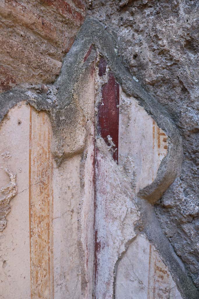 Detail of remaining painted wall plaster on north wall in north-west corner of rear room.
