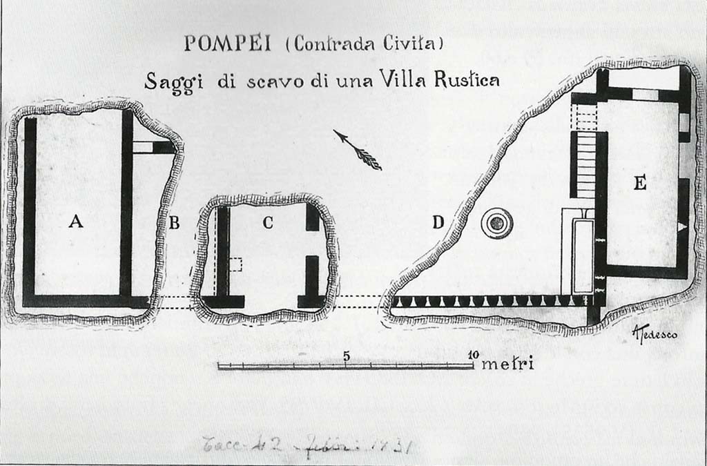 Pompeii, Villa rustica in Contrada Civita, Fondo Emanuela Brancaccio. February 1931 plan by A. Tedesco.